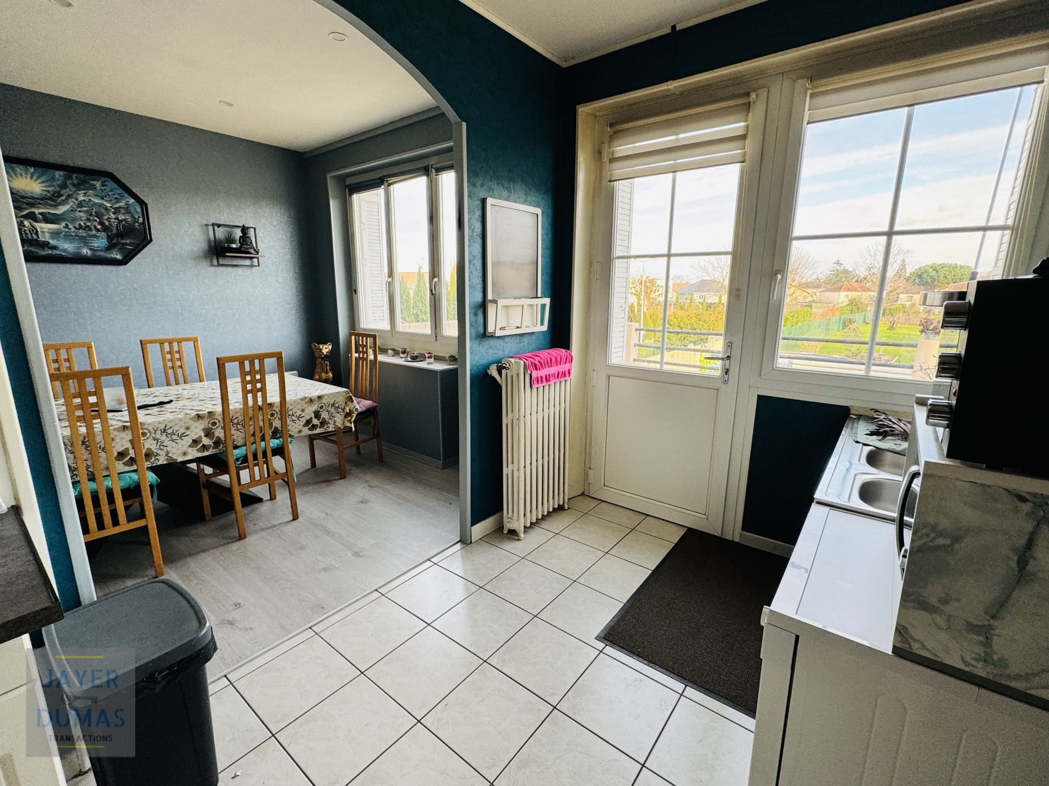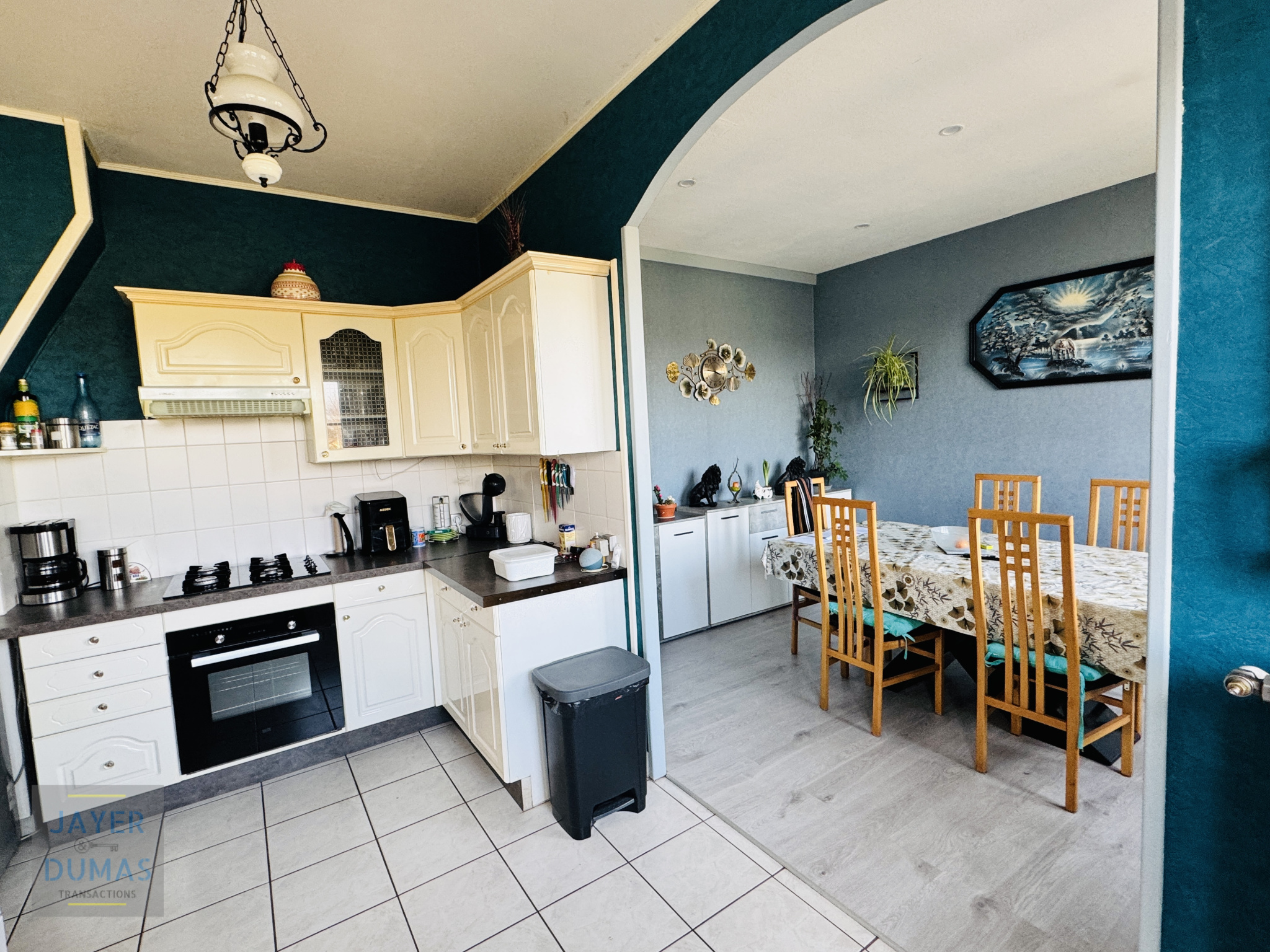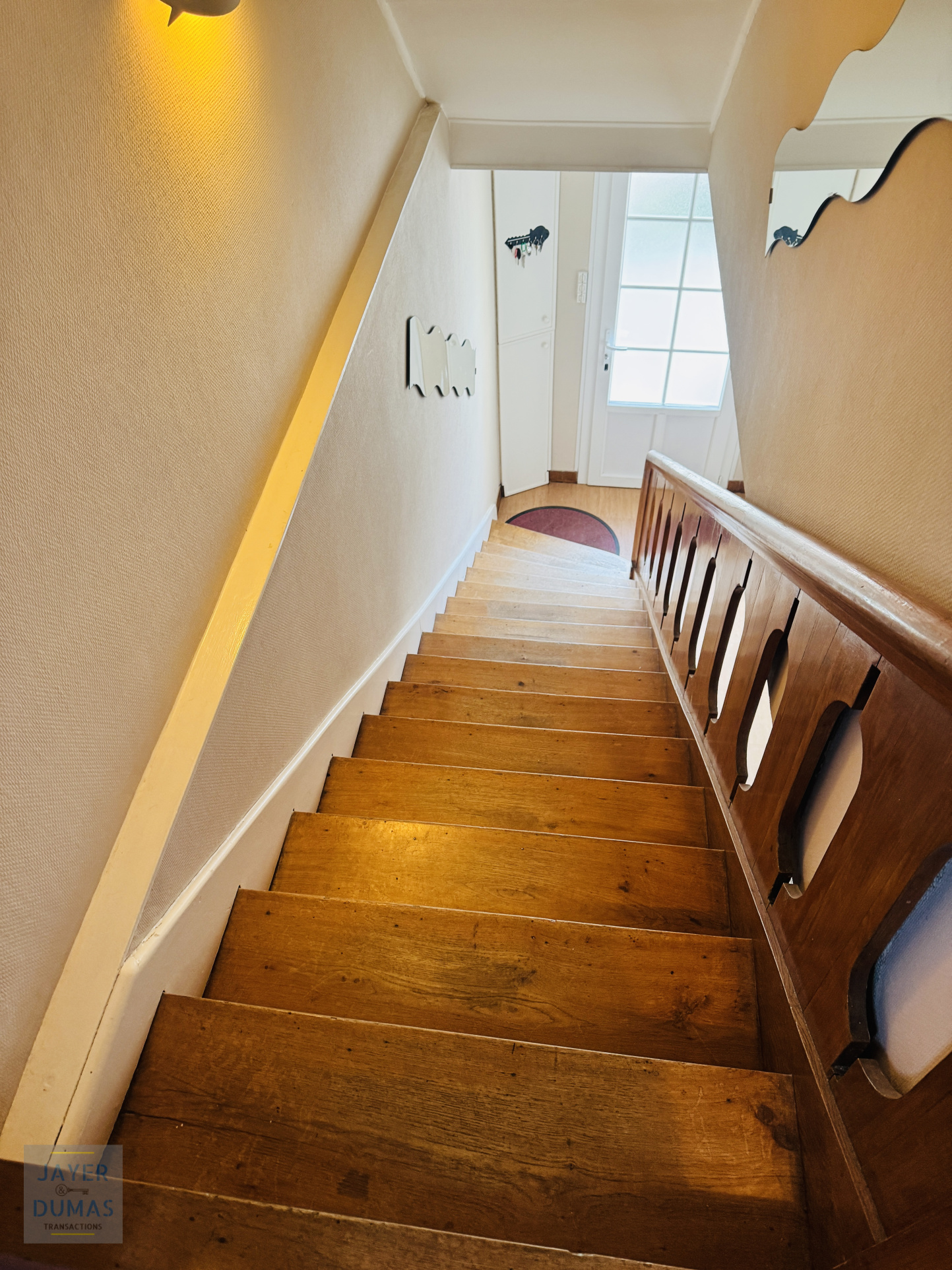 A l'étage : palier desservant séjour, cuisine équipée donnant accès à une belle terrasse, salle à manger, chambre, salle d'eau, WC, rangement et dégagement -